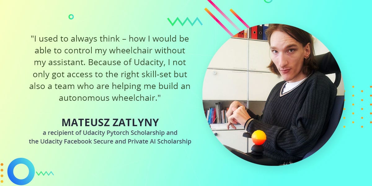 We came across one such story recently of Mateusz Zatylny, a recipient of the Udacity Pytorch Scholarship and the Udacity Facebook Secure and Private AI Scholarship, who is now building an autonomous technology driven wheelchair along with a group of Udacians he met during the Pytorch Scholarship program. Mateusz is a patient of generalized Dystonia, a movement disorder that is not limited to a single part of the body. But that clearly didn’t deter him from achieving great things. He can’t control his wheelchair by himself, so he decided to build an autonomous technology driven wheelchair that could help him and many more to safely maneuver through daily life.