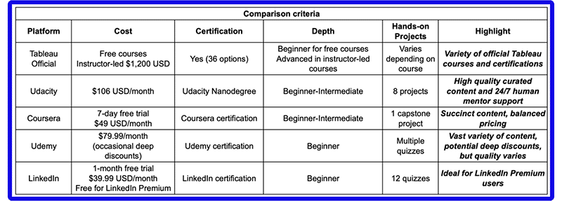 - Certification: Offers 36 certifications, like Tableau Desktop Specialist ($100 exam fee).