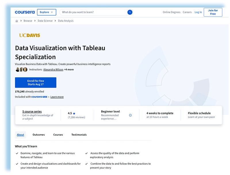 This 5-course Coursera specialization, taught by UC Davis instructors, dives into Tableau fundamentals, design principles, analytics, and data storytelling, though it doesn’t offer university credit.