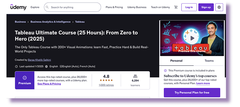 4. Udemy Tableau Ultimate Course (25 Hours): From Zero to Hero (2025):