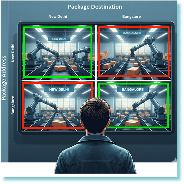Imagine you’re overseeing an automated warehouse where robotic arms sort packages bound for two destinations: New Delhi and Bangalore. To understand how well these robots are performing, we use a Confusion Matrix, much like the one you see. Each square on the screen represents a specific outcome. The top-left square shows packages correctly sorted for New Delhi (True Positives). The bottom-right square highlights packages correctly sent to Bangalore (True Negatives).